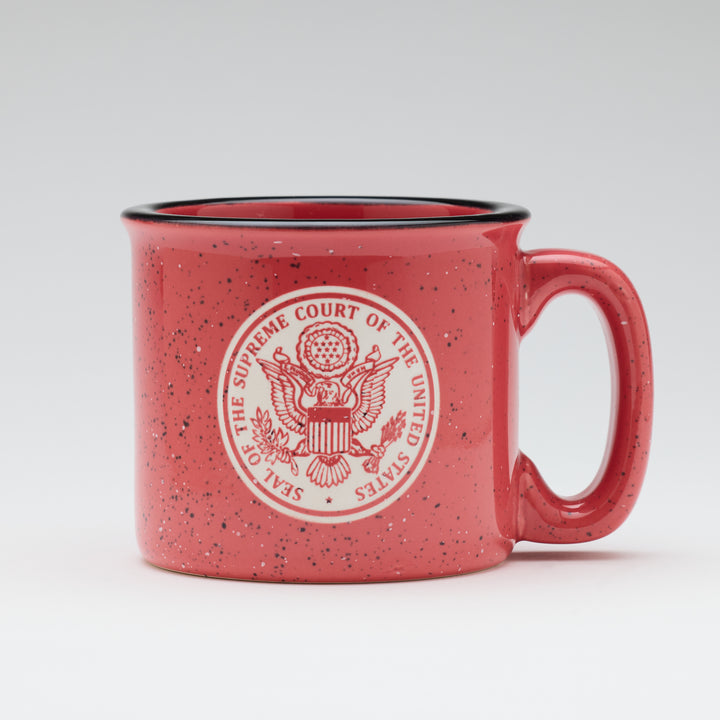 This Mug is a 15 oz. campfire-style ceramic mug with rustic charm. It features vibrant colors with white and black specks, a sleek black rim, and a deep etching of the Supreme Court Seal. They are available in various colors and offer durability and style. Enjoy your favorite beverages while showcasing your appreciation for the Supreme Court.