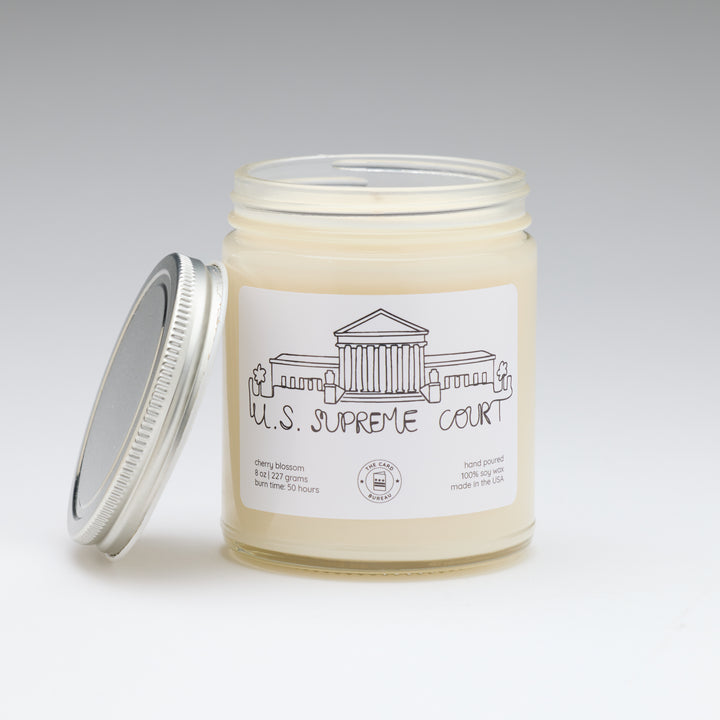 This candle is crafted to embody the solemnity and tradition of the highest court in the land, Ideal for law enthusiasts, legal professionals, or anyone with a reverence for the judicial branch, this candle serves as both a thoughtful gift and a symbolic piece of decor — perfect for a study, office, or chambers. It's made of natural soy wax with a blend of fragrance oil (cherry blossom). Lead free cotton wicks. The glass jar and tin lid are 100% recyclable or reusable.